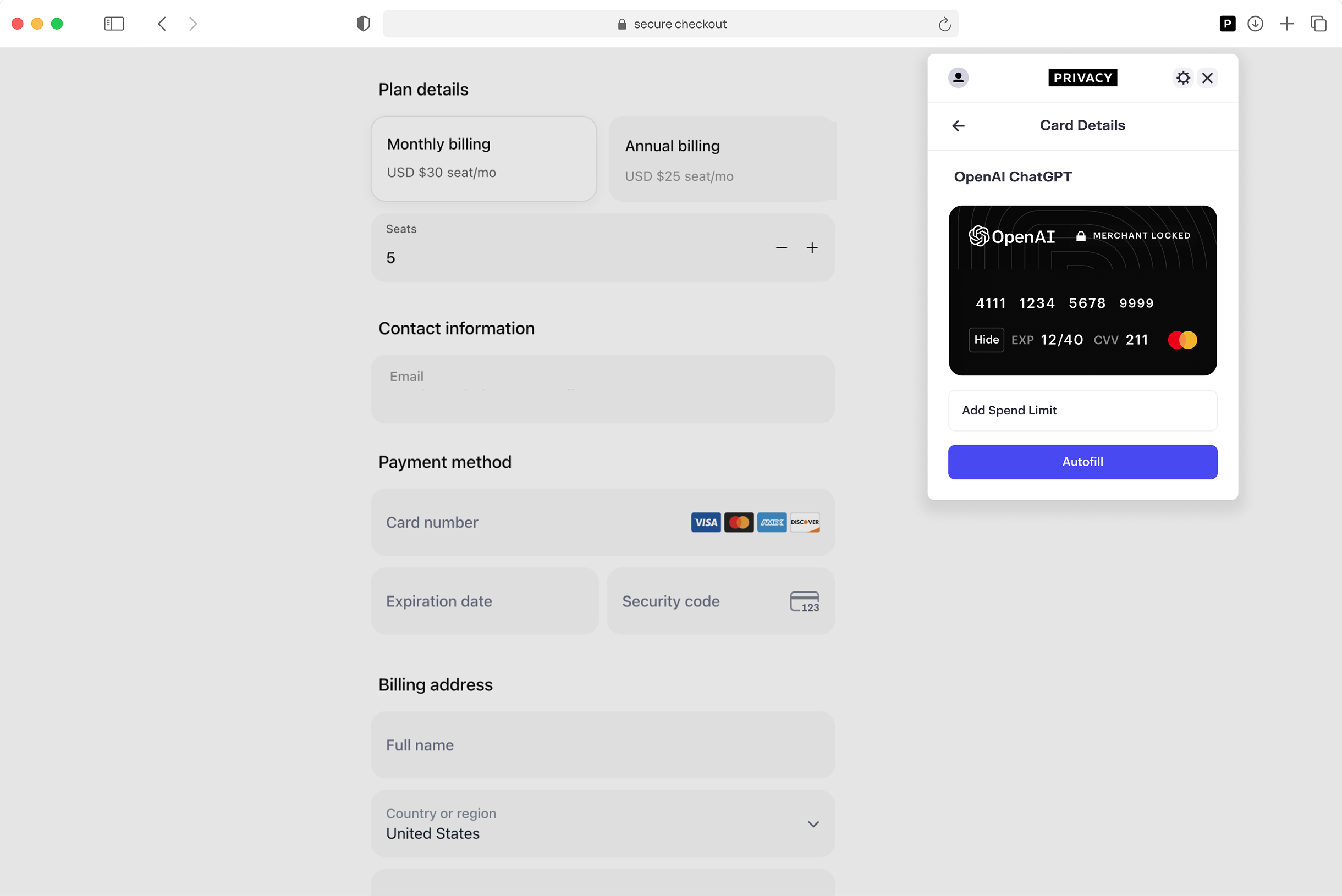 Checkout instantly using autofill for your Privacy Virtual Cards.