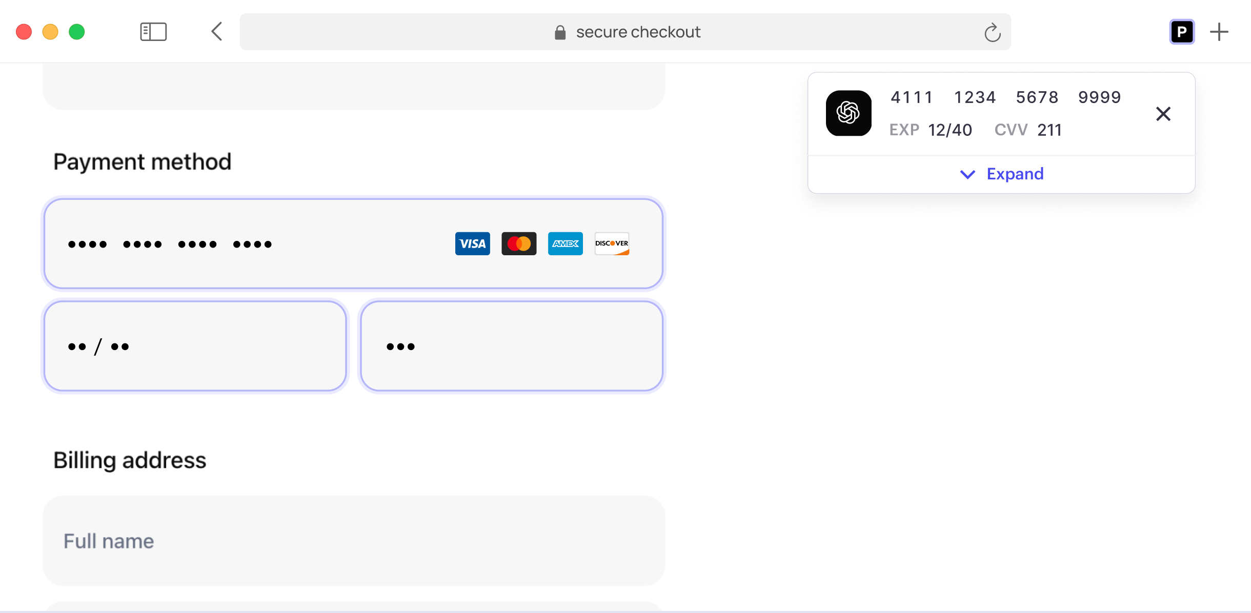 The Privacy Browser Extension enables you to autofill existing card numbers from your wallet each time you checkout online.